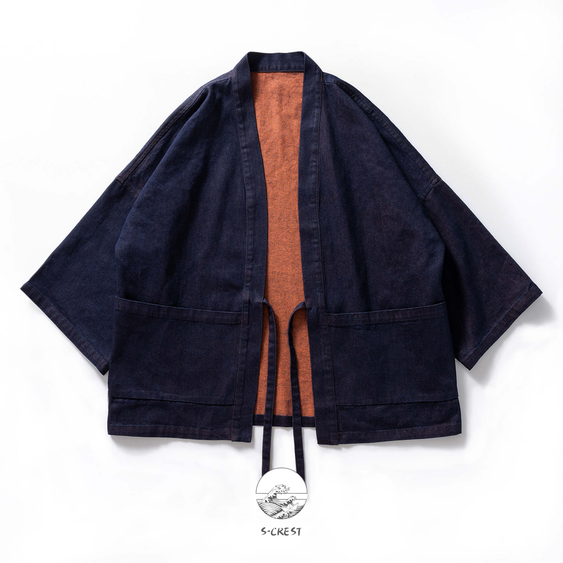 Fully reversible, featuring contrasting indigo and burnt-orange sides for two distinct looks in one. Crafted from premium cotton with a relaxed drape and dropped sleeves, it layers effortlessly over tees or shirts. Designed for smooth transitions between work, travel, and weekend wear, a modern nod to the Japanese Haori with California ease.